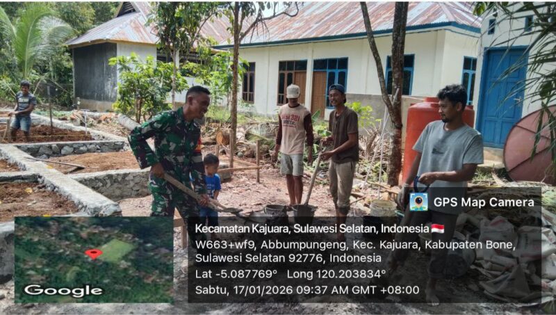 BONE – Babinsa Koramil 1407-18/Kajuara Serda Alimuddin, melaksanakan kegiatan karya bakti membantu pembangunan pondasi rumah warga di Desa Abbumpungeng, Kecamatan Kajuara, Kabupaten Bone. Sabtu Siang (17/01/26).