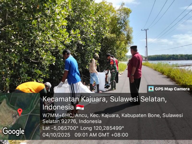 BONE – Babinsa Koramil 1407-18/Kajuara Koptu Abdul Rahman melaksanakan kegiatan kerja bakti pembersihan sampah yang berserakan di sepanjang pinggir jalan Desa Ancu, Kec. Kajuara, Kab. Bone. Sabtu siang (04/10/25).