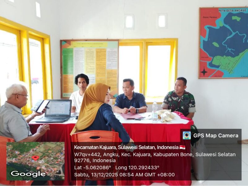 Bone – Babinsa Koramil 1407-18/Kajuara Sertu Darling melaksanakan Komunikasi Sosial (Komsos) bersama perangkat desa di Desa Angkue, Kecamatan Kajuara, Kabupaten Bone. Sabtu siang (13/12/2025).