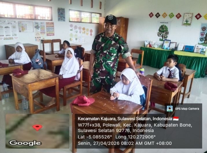 BONE – Babinsa Koramil 1407-18 Kajuara, Serka Yasir Agam, melaksanakan kegiatan pemberian wawasan kebangsaan (Wasbang) kepada para siswa SD 12/79 Polewali yang bertempat di Desa Polewali, Kecamatan Kajuara, Kabupaten Bone. Senin (27/04/2026).