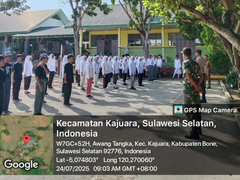 BONE – Babinsa Koramil 1407-18/Kajuara Sertu Muhlis bersama Bhabinkamtibmas melaksanakan pembinaan kepada calon Pasukan Pengibar Bendera Pusaka (Paskibraka) Kecamatan di lapangan upacara SMAN 8 Bone, Kelurahan Awang Tangka, Kecamatan Kajuara, Kabupaten Bone. Kamis (24/07/2025)