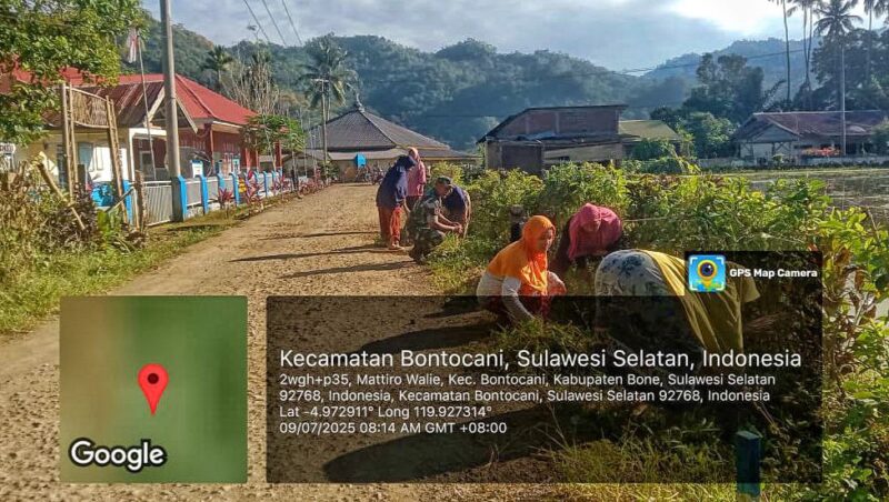 BONE – Babinsa Koramil 1407-20/Bontocani Serka Laode Fajeri bersama warga Desa Watangcani melaksanakan kerja bakti atau bersih-bersih lingkungan yang berlangsung di wilayah Desa Watangcani, Kec. Bontocani, Kab. Bone. Rabu (09/07/25).