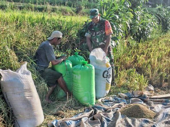 Dalam kegiatan tersebut, Serma Sudirman terjun langsung ke sawah, membantu petani mulai dari proses pengisian karung hingga mengangkat hasil panen ke tempat penampungan sementara.