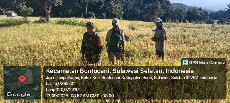 BONE – Babinsa Koramil 1407-20/Bontocani Sertu Edy Jaya turun langsung ke sawah bersama para petani untuk melakukan pengecekan kondisi tanaman padi yang mulai menguning dan siap untuk dipanen di Lingk. Tanjung, Kel. Kahu, Kec. Bontocani, Kab. Bone. Rabu siang (17/09/2025)