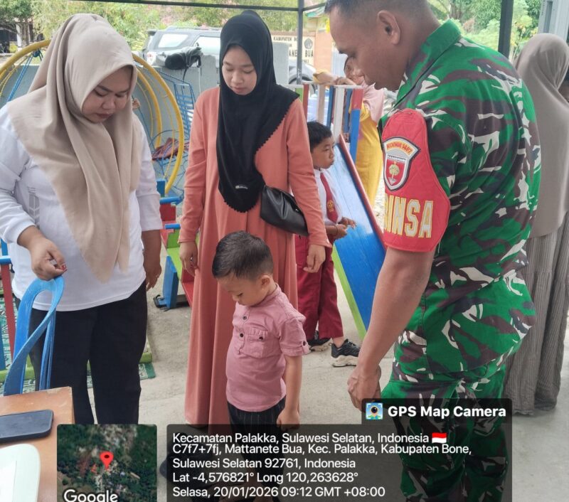 BONE – Babinsa Koramil 1407-21/Palakka Koptu Ahmad Amir, melaksanakan pendampingan kegiatan Pos Pelayanan Terpadu (Posyandu) yang bertempat di Balai Desa Mattanete bua, Kecamatan Palakka, Kabupaten Bone. Selasa Siang (20/01/26).