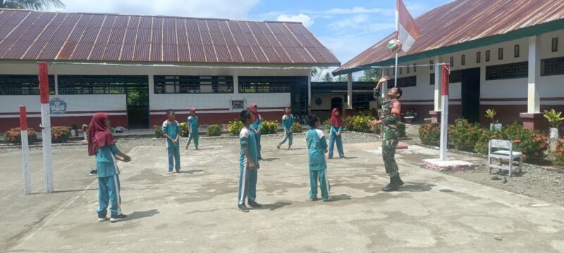 BONE – Babinsa Koramil 1407-15/Mare Serda Abdul Majid melaksanakan pelatihan olahraga bola voli kepada siswa-siswi Sekolah Dasar Inpres 5/81 yang berlokasi di Desa Kadai, Kec. Mare, Kab. Bone. Kamis (11/09/25).