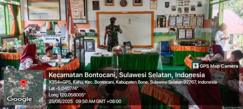 BONE – Babinsa Koramil 1407-20/Bontocani Sertu Edy Jaya, memberikan pembelajaran matematika dengan menggunakan metode “Gasing” (Gampang, Asyik, dan Menyenangkan) kepada siswa-siswi kelas II SD Negeri 10/73 Kahu, Kec. Bontocani, Kab. Bone. Senin siang (25/08/25).