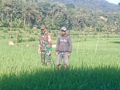 Sertu Edy Jaya bersama petani setempat memantau kondisi lahan pertanian dan memberikan beberapa saran teknis yang dapat meningkatkan hasil panen padi di wilayah tersebut.