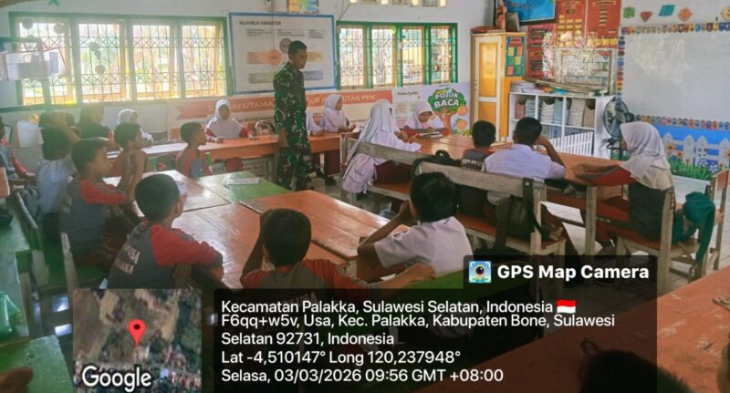 BONE – Babinsa Koramil 1407-21/Palakka Serda Sudarman melaksanakan Pembinaan Wawasan Kebangsaan (Binwanwil) kepada para siswa SDN 28, Desa Usa, Kec. Palakka, Kab. Bone. Selasa Siang (03/03/26).
