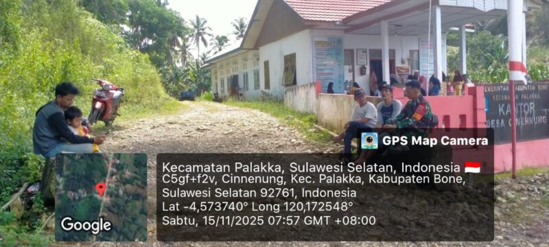 BONE – Babinsa Koramil 21/Palakka Kodim 1407/Bone Sertu Ikmal Malik melaksanakan kegiatan komunikasi sosial (Komsos) bersama warga masyarakat Desa Cinennung, Kecamatan Palakka, Kabupaten Bone. Sabtu Siang (15/11/25).