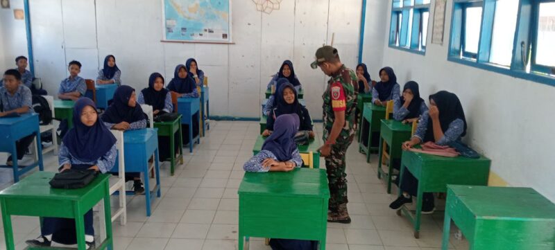 BONE – Babinsa Koramil 1407-03/Cenrana, Kopda Nur Salam, melaksanakan kegiatan Pembinaan Wawasan Kebangsaan (Wasbang) kepada para siswa di SMP Satap 3 Cenrana, Kecamatan Cenrana, Kabupaten Bone. Kamis (21/08/25).