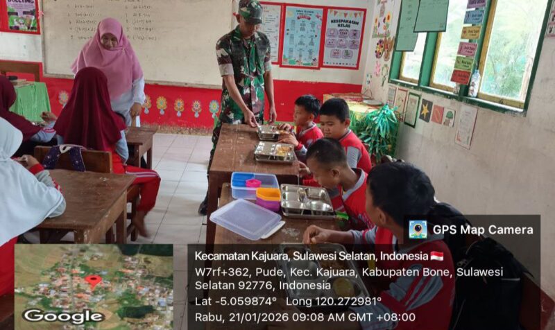 BONE – Babinsa Koramil 1407-18/Kajuara, Serda Sapiuddin, melaksanakan pendampingan penyaluran Makanan Bergizi Gratis (MBG) kepada siswa-siswi SDN 262 Desa Pude, Kec. Kajuara, Kab. Bone. Rabu Siang (21/01/26).