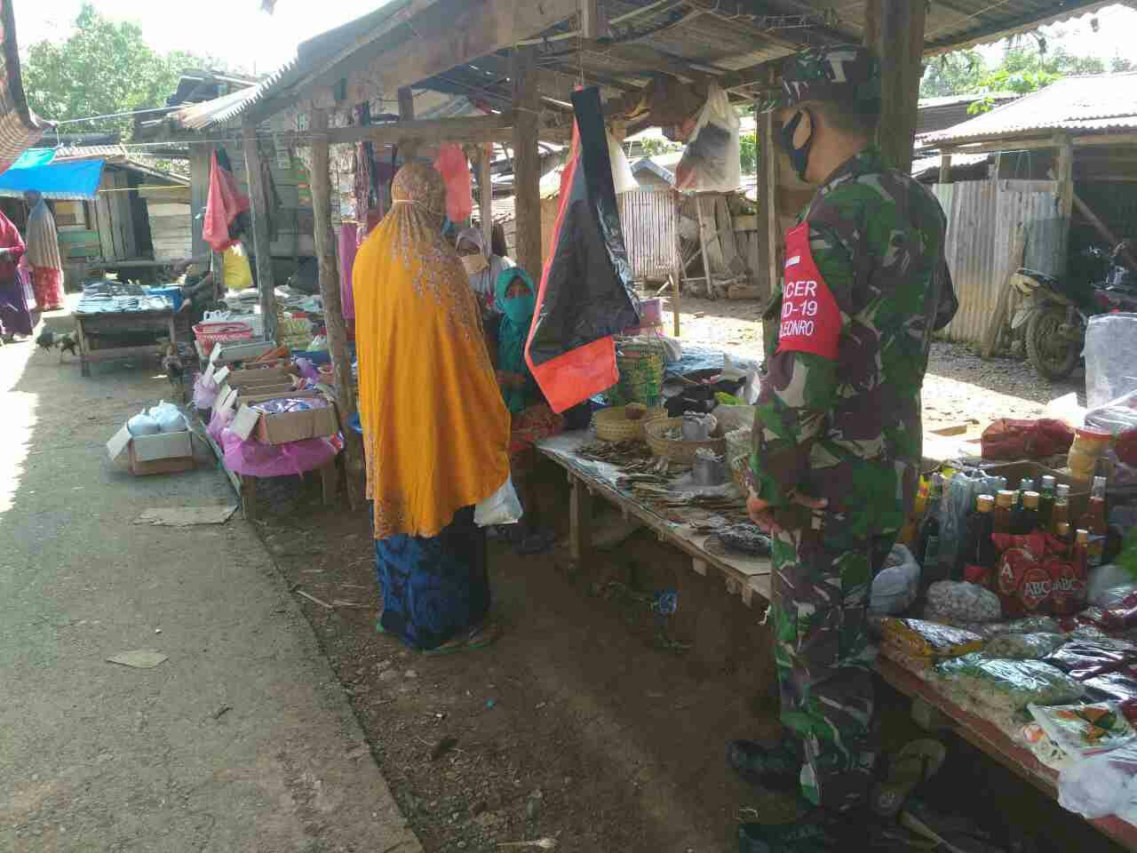 BONE – Babinsa Koramil 1407-14/Libureng tak henti-hentinya laksanakan himbauan kepada masyarakat untuk senantiasa menjalankan protokol kesehatan, bertempat di Pasar Tradisional Laccibunge, Desa Wanuawaru, Kec. Libureng, Kab. Bone. Rabu (11/05/22).