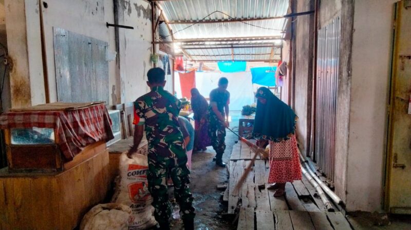 Dalam kegiatan tersebut, Serda Erwin ikut terlibat langsung membersihkan area pasar bersama pedagang, sekaligus memberikan arahan tentang pentingnya menjaga kebersihan dan ketertiban lingkungan pasar.