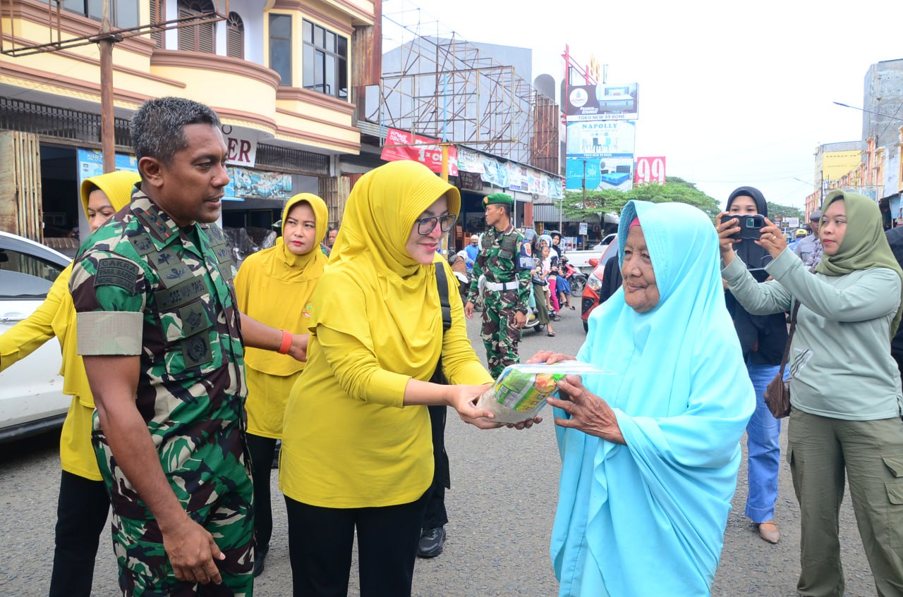 Kegiatan berbagi ini diwujudkan dalam bentuk pembagian ratusan paket sembako kepada warga masyarakat, satu persatu masyarakat didatangi oleh Dandim 1407/Bone dan istri diikuti para prajurit dan juga Ibu-ibu Persit lainnya.