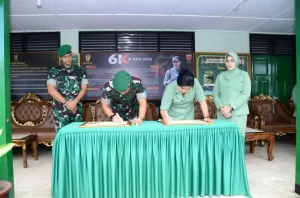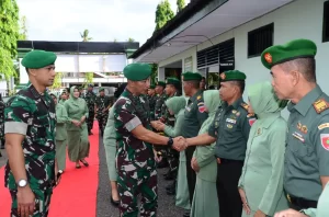Sesampainya di Makodim, Pangdam XIV/Hasanuddin Mayjen TNI Dr. Totok Imam Santoso, S.I.P., S.Sos.,M.Tr(Han) disambut langsung Komandan Kodim 1407/Bone Letkol Inf. Moch. Rizqi Hidayat Djohar beserta seluruh para Perwira, dan Ketua Persit Kartika Chandra Kirana Cabang XXV Ny. Nining Rizqi.