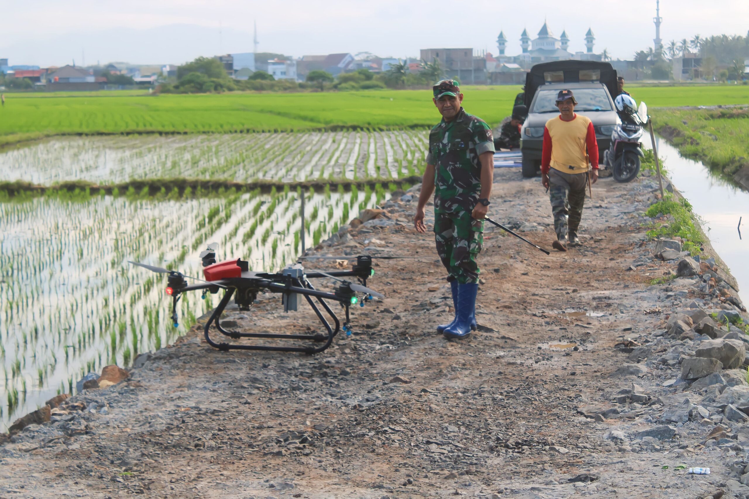 Pinrang_ Dandim 1404/Pinrang Letkol Inf Abdullah Mahua, SHI., M.M., memantau langsung pelaksanaan penyemprotan pestisida mempergunakan tekhnologi drone di lahan persawahan pertanian modern Kodim 1404/Pinrang…