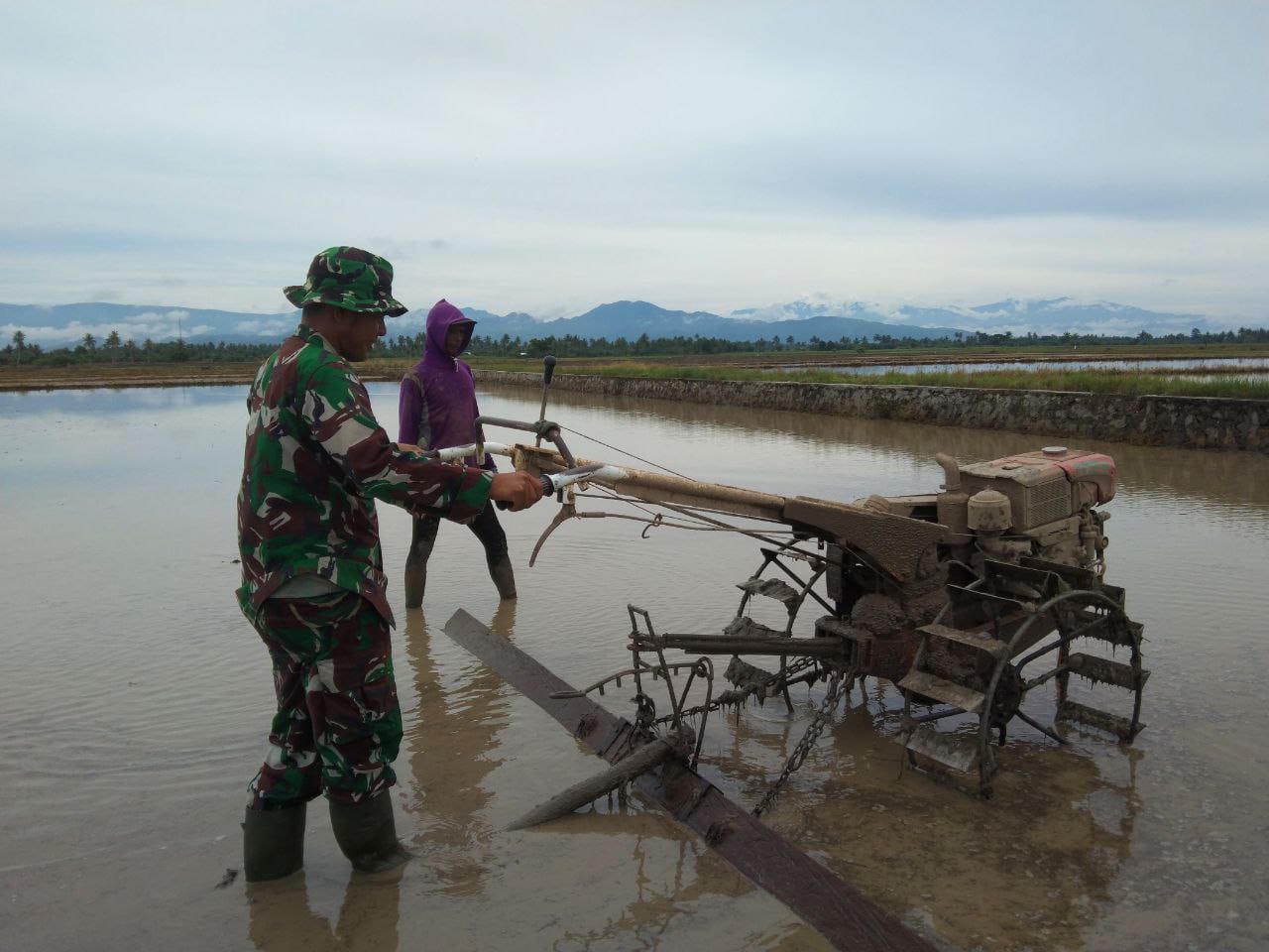 Pinrang_ Babinsa Koramil-06/Duampanua Kodim 1404/Pinrang, Sertu Masrurin mendampingi petani membajak sawah menggunakan hand traktor di Desa Massewae Kecamatan Duampanua Kabupaten Pinrang Provinsi Sulawesi Selatan,…
