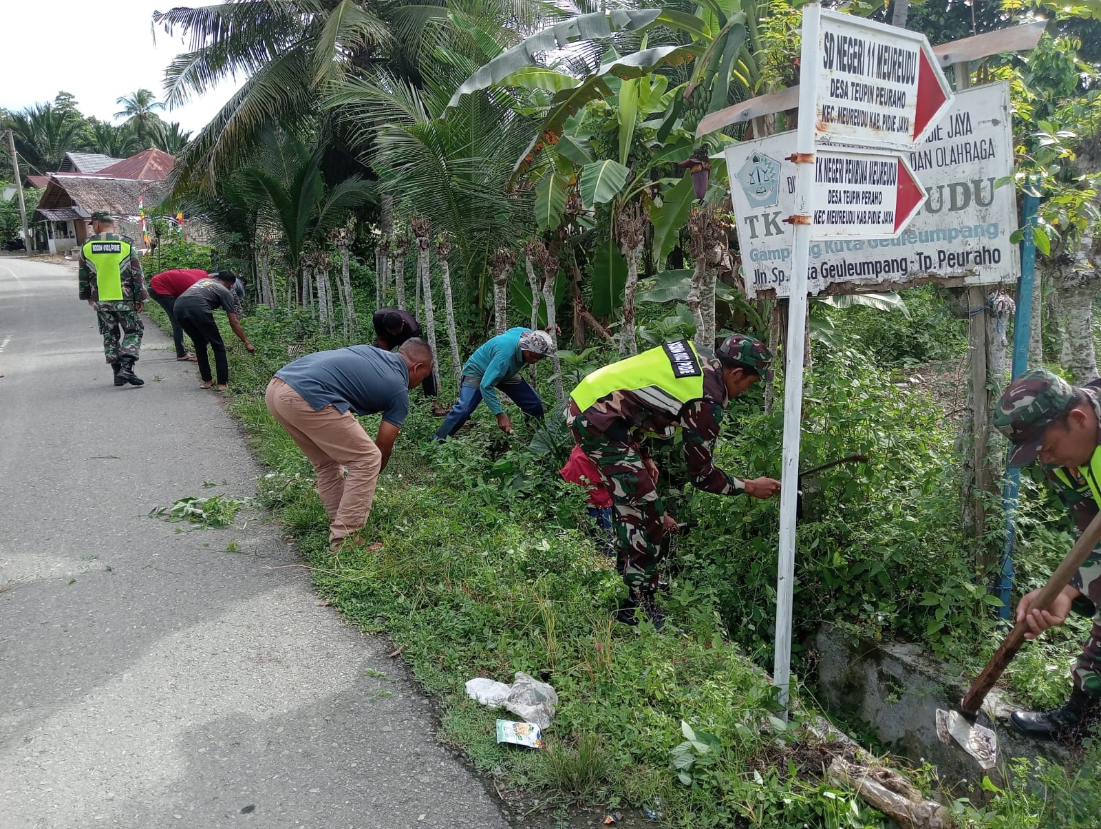 Babinsa Koramil 19/Merdu Kodim 0102/Pidie bersama lapisan masyarakat melaksanakan karya bakti membersihkan jalan dan parit di Jalan Desa Teupin Peuraho Kecamatan.Meureudu Kabupaten. Pidie Jaya….