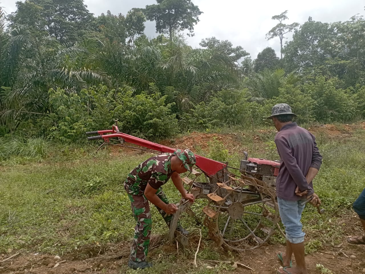 Nagan Raya,- Babinsa Koramil 04/Beutong Kodim 0116 Nagan Raya.Serda Saiful Bahri, melaksanakan kegiatan pendampingan kepada petani menanam kacang tanah di kebun milik Bapak zais…