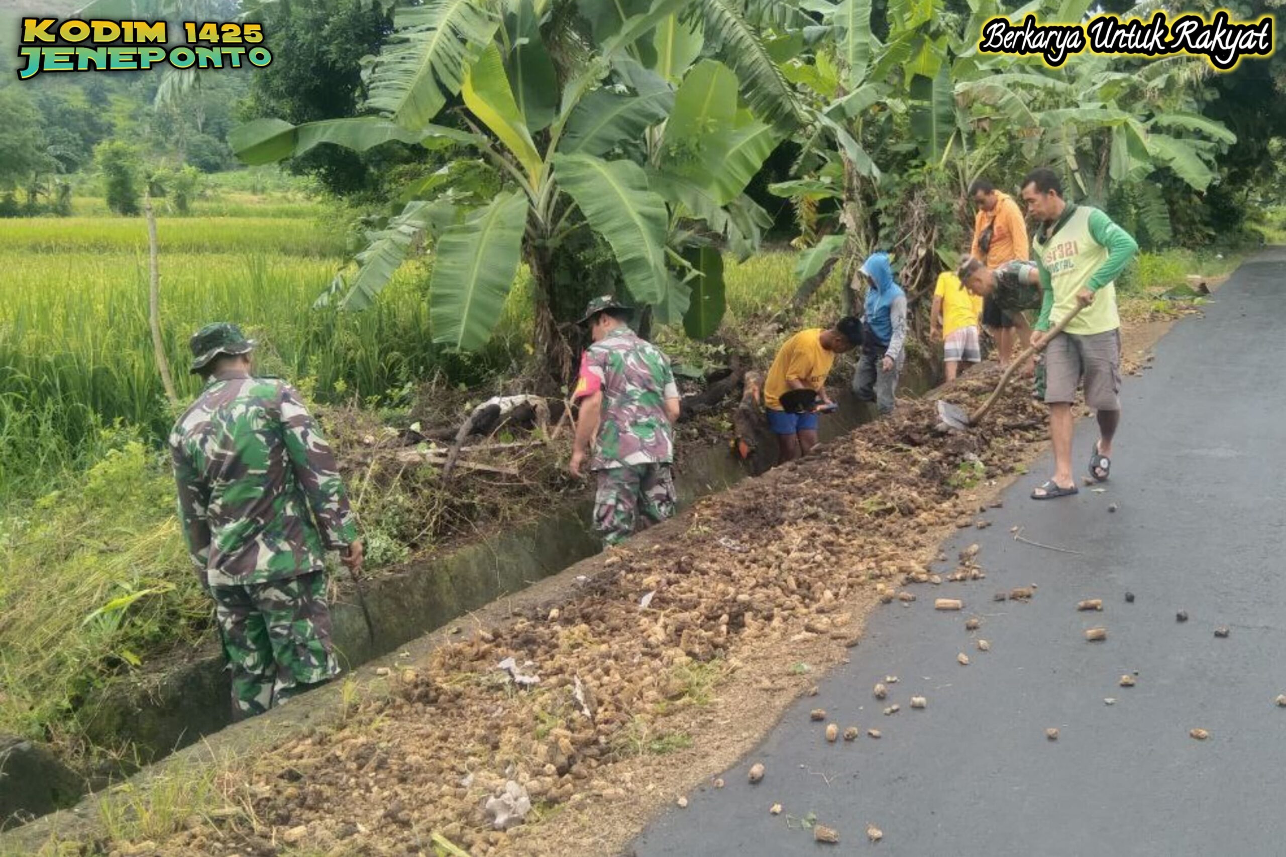SINJAI. Babinsa Desa Pasimarannu Koramil 1424-04/Sinjai Timur Kodim 1424/Sinjai Sertu Mustari bersama masyarakat melaksanakan kegiatan karya bakti pembersihan selokan di sepanjang jalan Desa Pasimarannu…