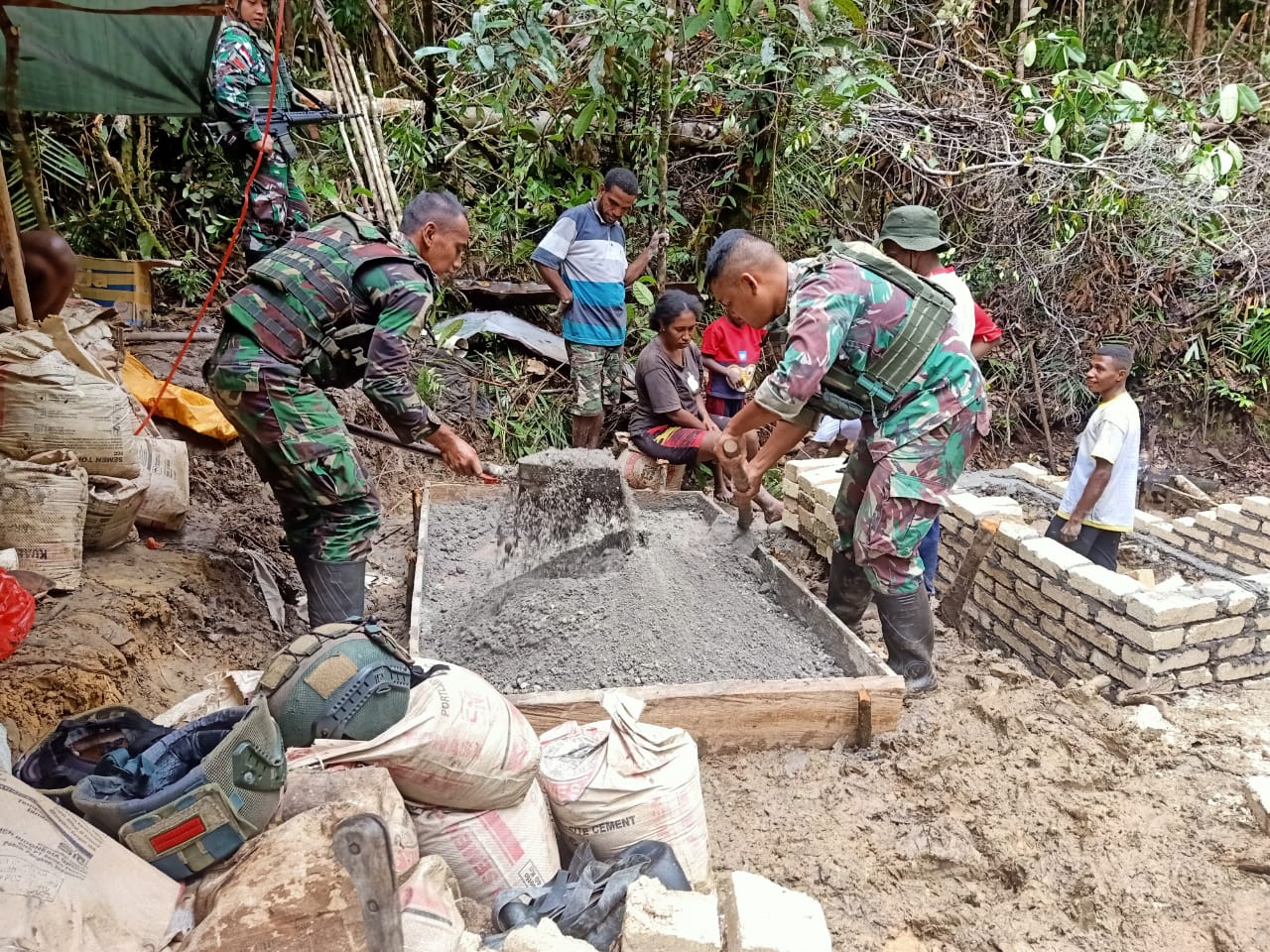 Maybrat_Satuan Tugas Batalyon Infanteri 133/Yudha Sakti yang sedang melaksanakan tugas didaerah Maybrat-Papua Barat Daya ikut serta membantu masyarakat membangun bak penampungan air bersih untuk…