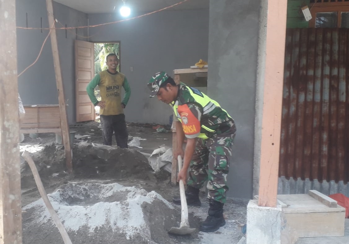 Nagan Raya, Ikut berperan dalam mengatasi beban warga binaan, Babinsa Posramil Kuala Pesisir Sertu Komarudin bantu warga mengaduk semen untuk plester dinding Rumah warga…