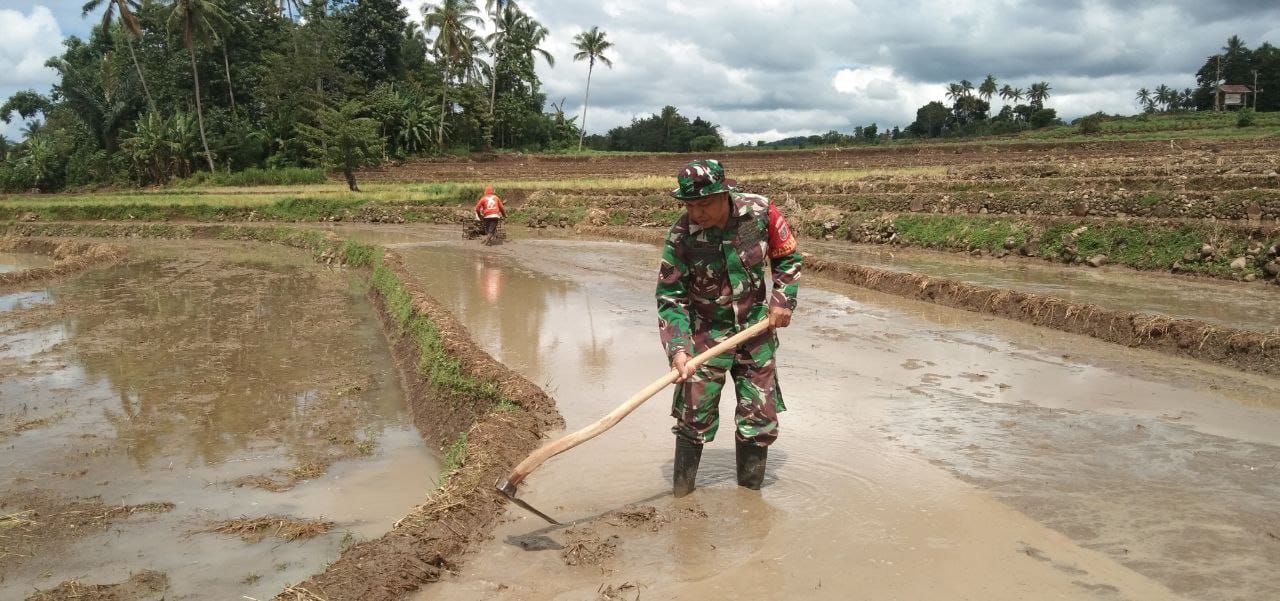 SINJAI. Babinsa Kelurahan Sangiasseri Koramil 1424-05/Sinjai Selatan Kodim 1424/Sinjai Serka Kamaruddin bersama melaksanakan pendampingan Hanpangan membantu pengolahan sawah milik milik Bapak Rusdi anggota Kelompok…