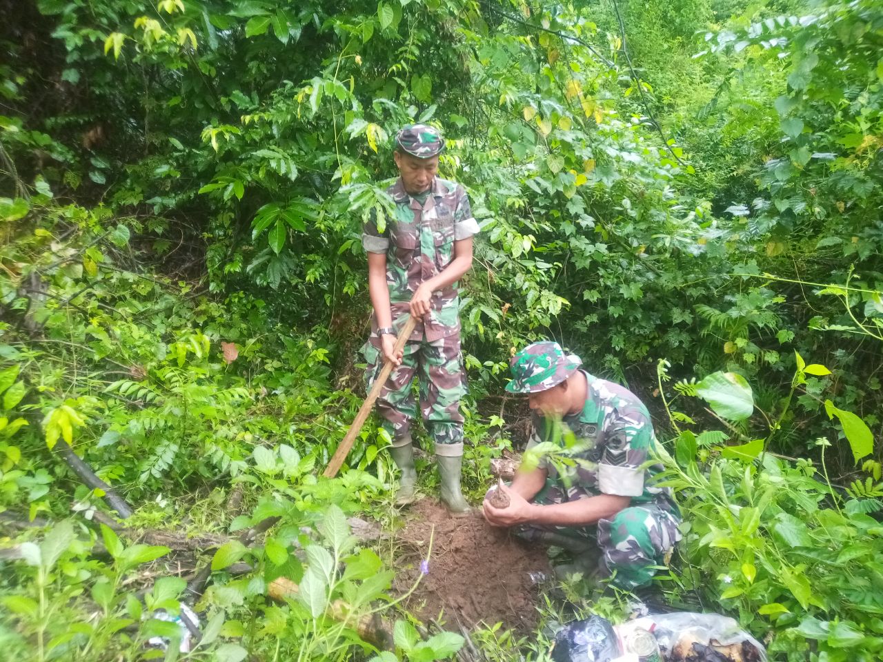 SINJAI. Personel Koramil 1424-04/Sinjai Timur Kodim 1424/Sinjai bersama masyarakat melaksanakan kegiatan karya bakti penanaman bibit pohon Mahoni di kawasan rawan longsor di desa Panaikang…