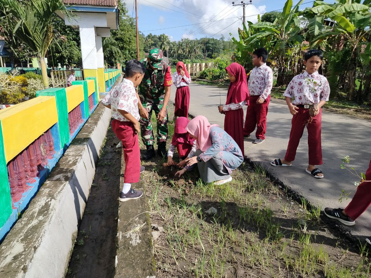 SINJAI. Babinsa Kel. Biringere Koramil 1424-01/Sinjai Utara Kodim 1424/Sinjai Serka Suardi bersama siswa SD No 30 Sinjai melaksanakan kegiatan karya bakti penanaman pohon Ketapang…