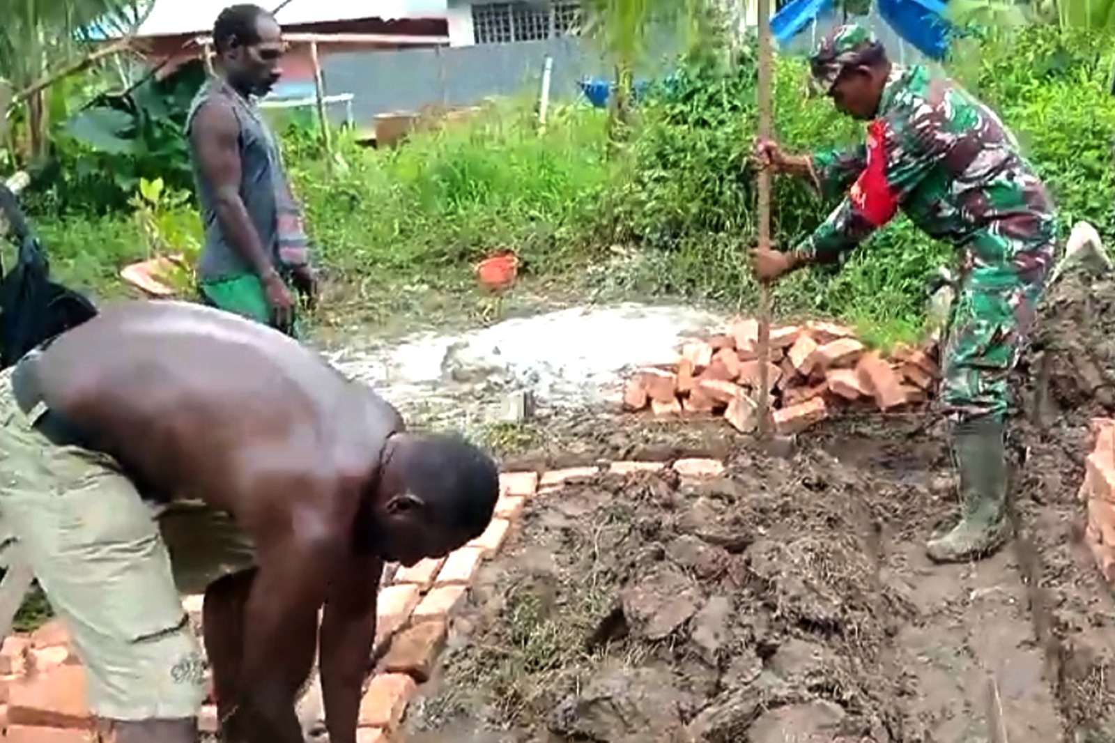 Pendim1809maybrat- Anggota Satgaster Kodim 1809/Maybrat Serda Abraham Fakdawer melaksanakan gotong royong pembangunan Gereja di kampung Eway distrik aitinyo tengah, Kab. Maybrat, Papua Barat Daya….