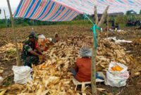 BONE – Babinsa Koramil 1407-02/Dua Boccoe Kopka Adam Talutu dampingi petani saat panen dan proses pengupasan jagung di Desa Sangrangeng, Kec. Dua Boccoe, Kab….
