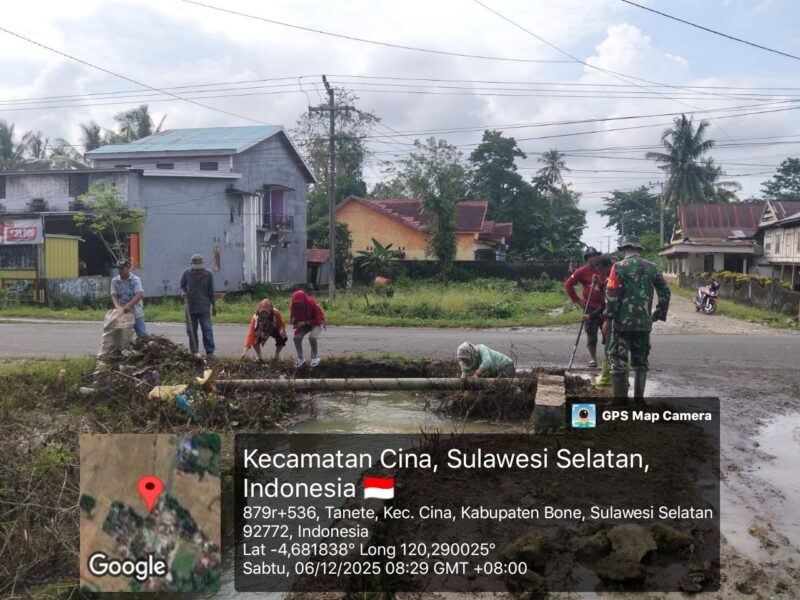 BONE – Babinsa Koramil 12/Cina Kodim 1407/Bone melaksanakan kegiatan karya bakti pembersihan saluran air di Kelurahan Tanete, Kecamatan Cina, Kabupaten Bone. Sabtu siang (06/12/25).