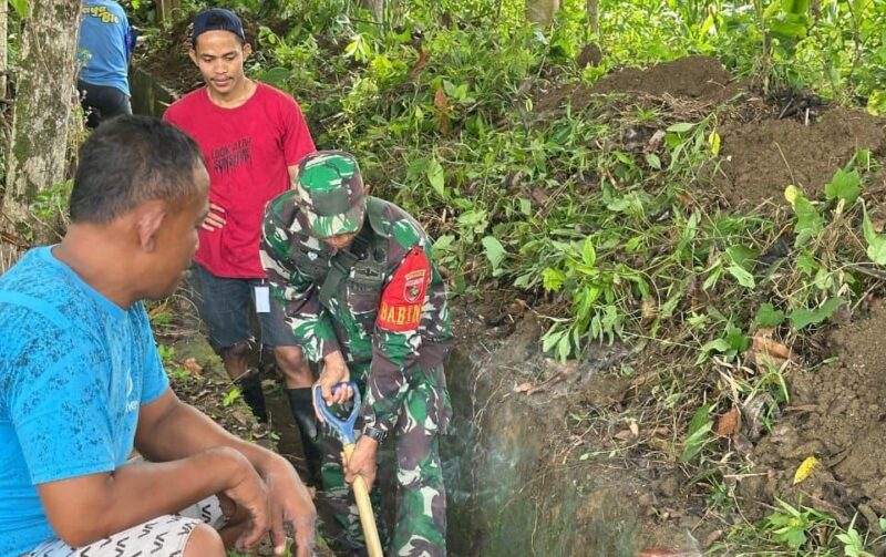 Sertu Suwardi bersama warga terjun langsung membersihkan saluran air dari sampah dan endapan tanah yang menghambat aliran.
