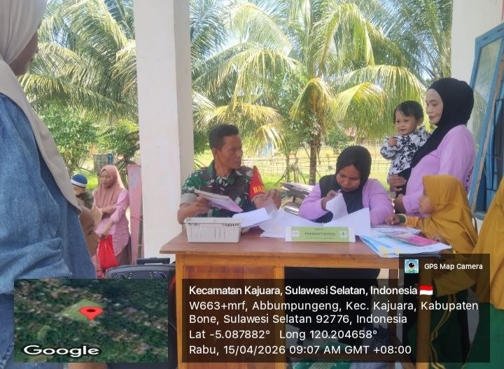 Bone – Babinsa Koramil 1407-18/Kajuara Serda Alimuddin melaksanakan pendampingan Posyandu di Desa Abbumpungeng, Kecamatan Kajuara, Kabupaten Bone. Rabu siang (15/04/26).