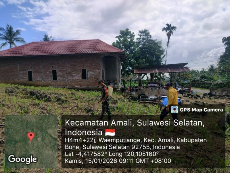 Bone – Babinsa Koramil 1407-05/Ulaweng Serda Sumardi, melaksanakan pendampingan pemantauan pemeliharaan lahan jagung milik warga binaan di Dusun Barang, Desa Waemputange, Kecamatan Amali, Kabupaten Bone, Kamis siang (15/01/2026).