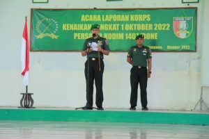 BONE – Dandim 1407/Bone Letkol Inf. Moch. Rizqi Hidayat Djohar pimpin Acara Laporan Korps Kenaikan Pangkat Perwira, Bintara dan Tamtama periode 1 Oktober 2022 dalam suasana Tertib dan lancar di Aula Tauwarani, Jl. Lapatau Watampone, Kelurahan Manurungge, Kecamatan Tanete Riattang, Kabupaten Bone. Kamis (06/10/2022).
