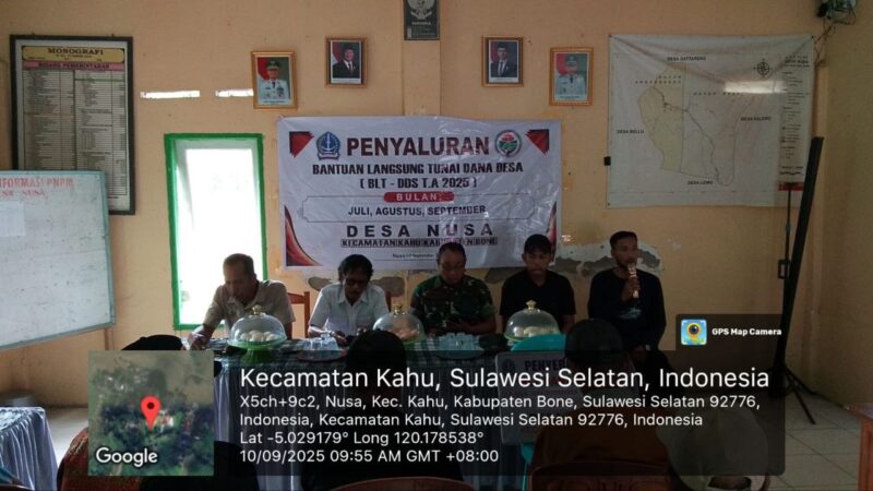 Bone – Danramil 1407-19/Kahu Lettu Kav Suwardi, S.H hadiri kegiatan penyaluran Bantuan Langsung Tunai Dana Desa (BLT DD) tahap III Tahun Anggaran 2025 yang berlangsung di Desa Nusa, Kecamatan Kahu, Kabupaten Bone. Jumat (12/09/25).