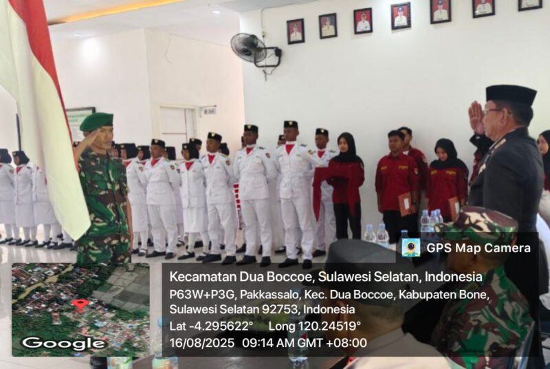 BONE – Dalam rangka menyambut Hari Ulang Tahun Kemerdekaan Republik Indonesia ke-80, Danramil 1407-02/Dua Boccoe bersama personel Koramil menghadiri kegiatan pengukuhan Pasukan Pengibar Bendera Pusaka (Paskibraka) tingkat Kecamatan Dua Boccoe. Sabtu Siang (16/08/2025).