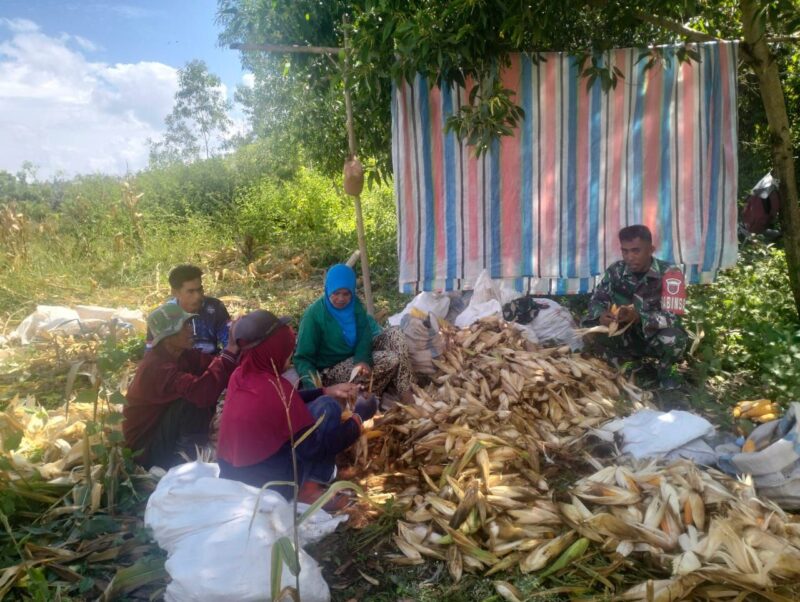 BONE – Pasca panen jagung, Babinsa Koramil 1407-15/Mare Serda Nisradi membantu warga mengupas kulit jagung di Desa Tellu Boccoe, Kec. Mare, Kab. Bone. Minggu (21/12/25).