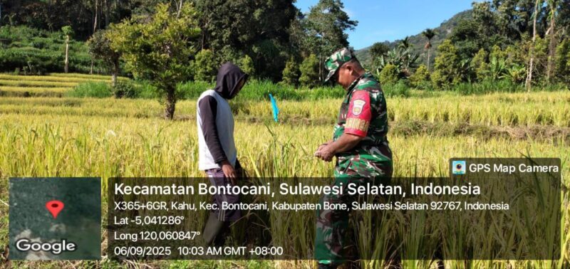 Seperti yang dilakukan Babinsa Koramil 20/Bontocani Serma Sudirman, saat turun langsung ke sawah membantu petani memeriksa tanaman padi yang mulai menguning dan siap untuk dipanen, Sabtu (6/9/2025).