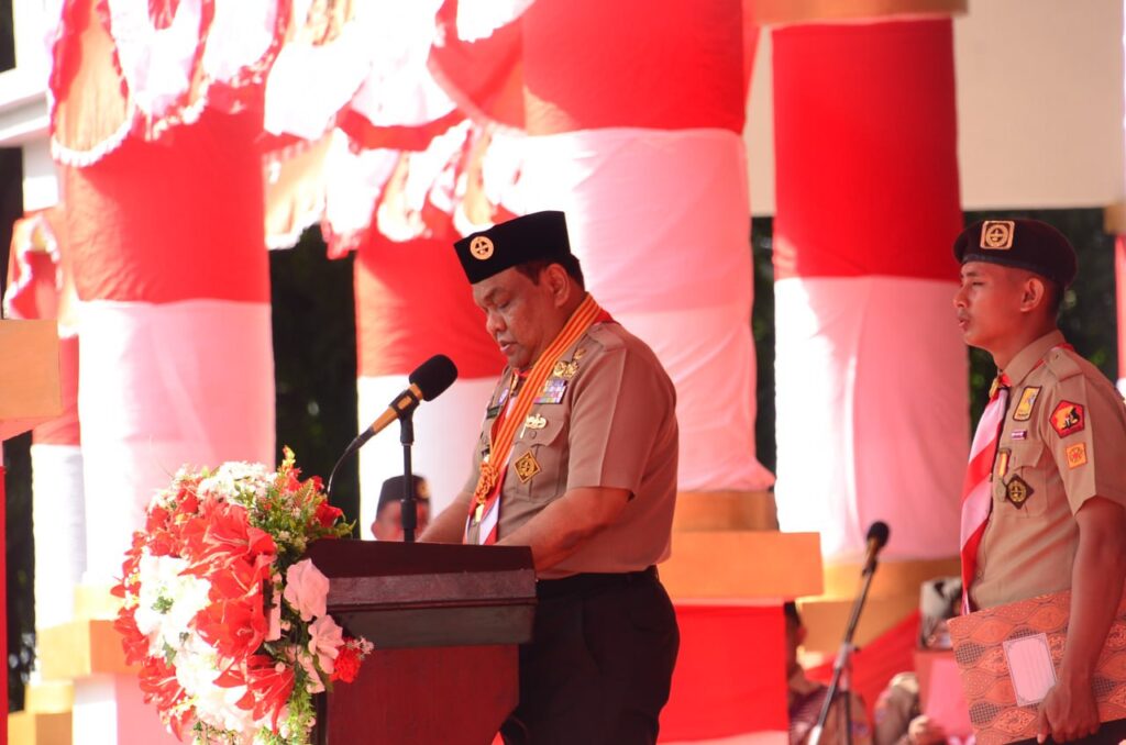 BONE – Dandim 1407/Bone Rem 141/Tp Letkol Inf. Moch. Rizqi Hidayat Djohar bersama Forkopimda mengikuti Apel Besar Dalam Rangka Peringatan Hari Pramuka ke 62 Ta. 2023 yang diselenggarakan oleh Kwartir Cabang Gerakan Pramuka Bone di Lap. Merdeka Watampone, Jl. Petta Ponggawae, Kab. Bone. Senin (14/08/23).
