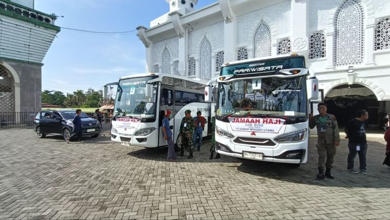 BONE – Puluhan Personel dari Kodim 1407/Bone bersama Instansi terkait lainnya melaksanakan pengamanan pemberangkatan Calon Jamaah haji Kabupaten Bone bertempat di pelataran Masjid Al Markaz Al Maarif Watampone, Jl. Ahmad Yani, Kab. Bone. Minggu (26/04/26).