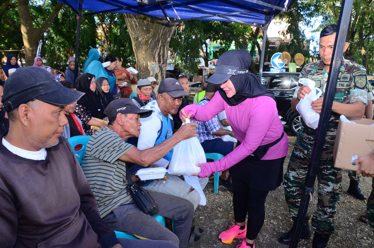 BONE – Dandim 1407/Bone Letkol Inf. Laode Muhammad Idrus bersama Ketua Persit Ny, Fitrianti Laode menggelar kegiatan sosial Jumat Berkah penyaluran nasi kotak dan ratusan sembako kepada masyarakat di Pasar Sentral Palakka, Kec. Tanete Riattang Barat, Kab. Bone. Jumat (30/05/25).
