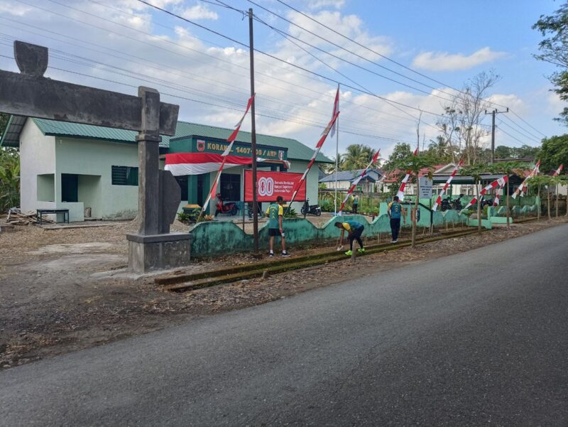 BONE – Dalam rangka menjaga kebersihan dan kerapian lingkungan, Personel Koramil 1407-06/Awangpone melaksanakan gotong royong pembersihan pangkalan yang berlokasi di Makoramil, Kecamatan Awangpone, Kabupaten Bone. Selasa (19/08/25).