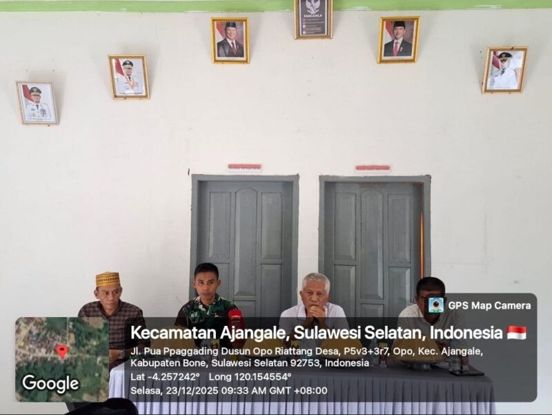Bone – Serda Erwin Babinsa Koramil 1407-01/Ajangale ikuti musyawarah dalam rangka pengusulan Pelaksana Tugas (PLT) Kepala Desa Opo yang dilaksanakan di Kantor Desa Opo, Kec. Ajangale, Kab. Bone. Selasa siang (23/12/25).