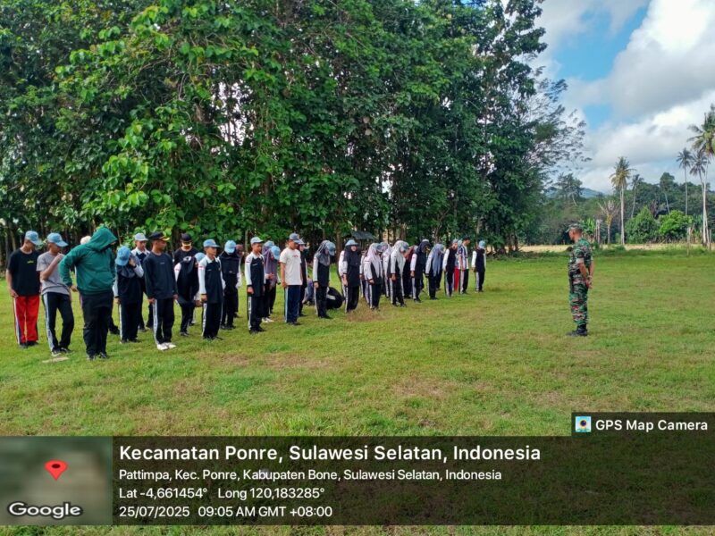 BONE – Sambut Hari Ulang Tahun (HUT) Kemerdekaan Republik Indonesia ke-80, Babinsa Koramil 1407-10/Ponre Serda Ismail melaksanakan pelatihan Pasukan Pengibar Bendera (Paskibra) tingkat Kecamatan Ponre.