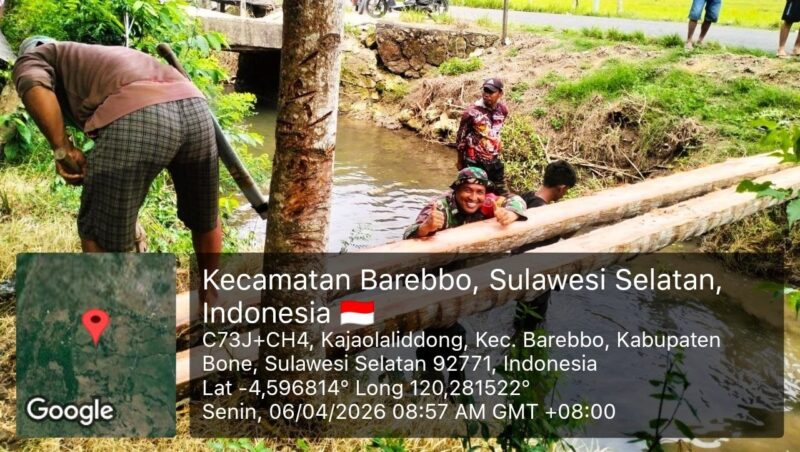 BONE – Babinsa Koramil 1407-11/Barebbo Sertu Pirman Usti membantu warga melaksanakan kerja bakti rehab jalan tani dan jembatan kayu penghubung di Dusun Bakke, Desa Kajaolalidong, Kecamatan Barebbo, Kabupaten Bone, Senin siang (06/04/2026).