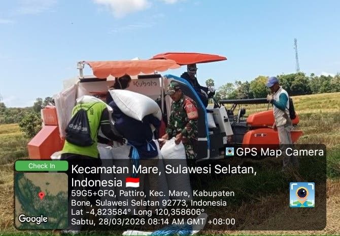 Bone – Babinsa Koramil 1407-15/Mare, Koptu Tahang, melaksanakan kegiatan pendampingan panen padi bersama kelompok tani Kala Mecu di Desa Pattiro, Kecamatan Mare, Kabupaten Bone, Sabtu siang (28/03/26).