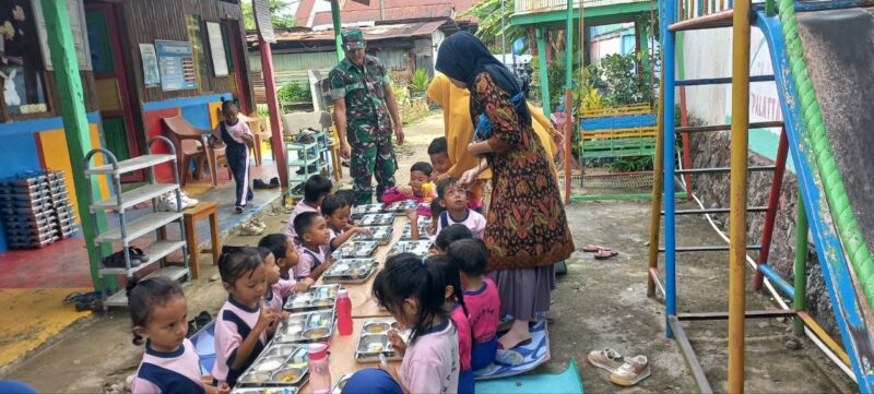 Sertu Kamaluddin turut mendampingi petugas dalam pendistribusian Makanan Bergizi Gratis kepada para siswa-siswi TK PGRI Palattae yang tampak antusias menerima bantuan tersebut.